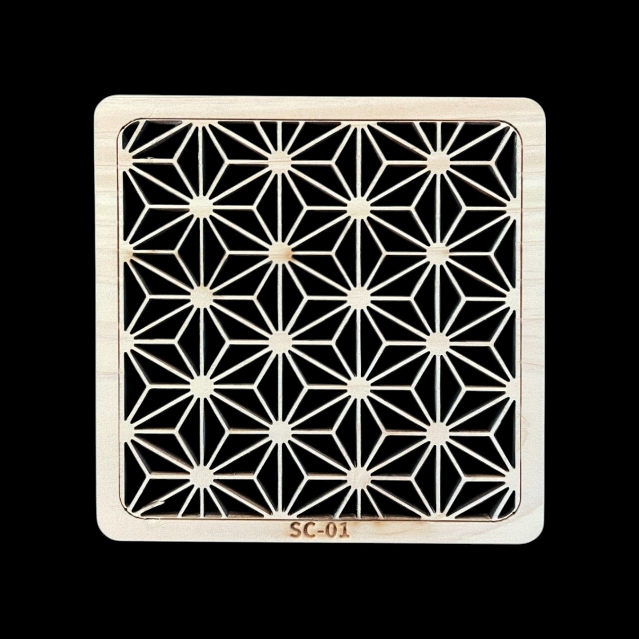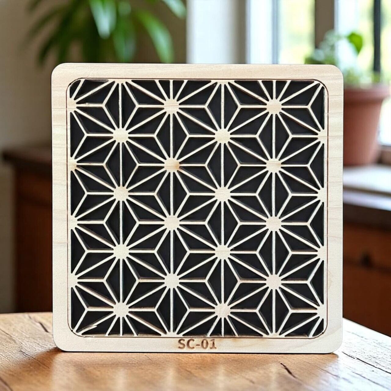 日本の伝統模様「麻の葉」をモチーフにした、木製のコースターです。麻の葉模様には、健やかな成長や魔除けの意味が込められており、古くから親しまれてきました。幾何学的で美しい模様は、和の雰囲気を大切にしながらも、モダンな空間にもよく馴染みます。