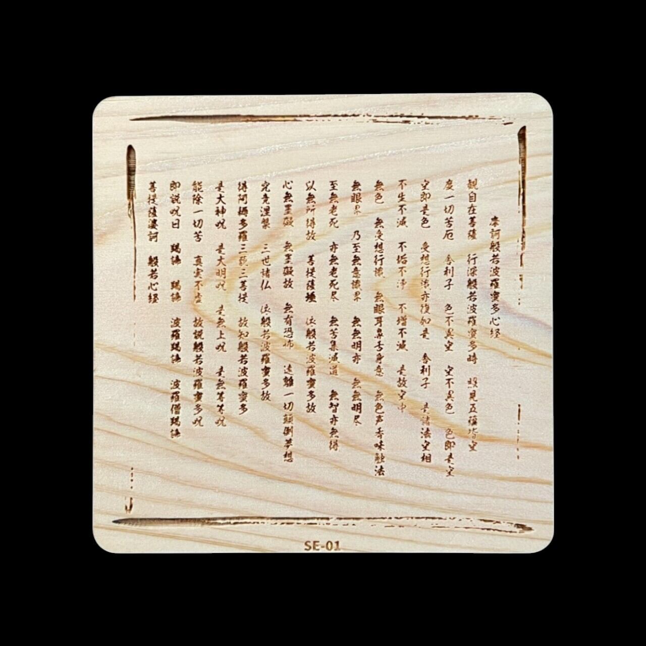 “空(くう)”の思想を表すこのお経には、迷いや不安を手放し、心を穏やかに導く智慧が込められています。木のぬくもりと経文の美しい流れが重なることで、見た目の落ち着きと心の安心感をもたらしてくれます。お茶の時間や瞑想、贈り物にも最適な、心に寄り添う一枚です。